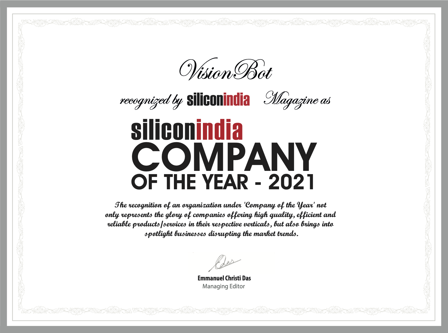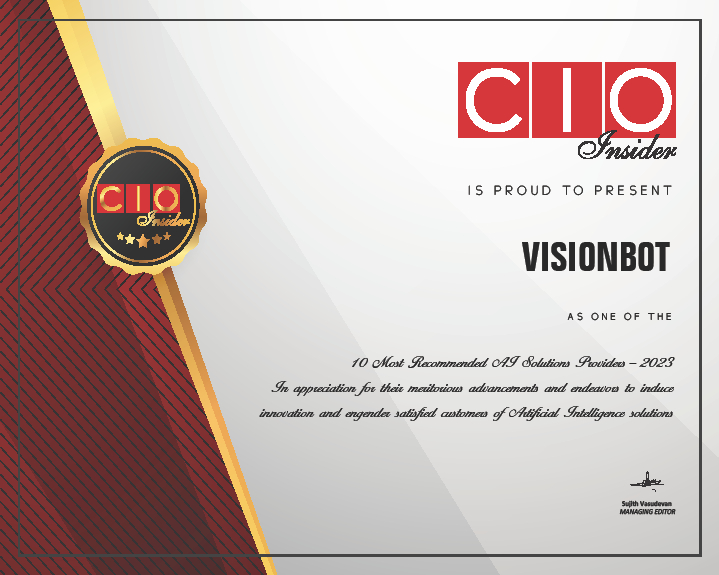 CIO Insider India Recognition of VisionBot as Company of the Year in the category Deep Learning for 2024. CIO Insider India Recognition of VisionBot as one of the Top 10 AI startup for the year 2023. SiliconIndia Recognition of VisionBot as Company of the Year in the category Deep Learning for 2021. CIO Insider India Recognition of VisionBot as one of the 10 Most Recommended AI Solutions Provider for 2020. CIO Insider India Recognition of VisionBot as one of the Top 10 AI startup for the year 2019. Recognition of VisionBot as a Company with right systems to deliver quality and Customer Satisfaction. Recognition of VisionBot as a Company which takes information security and data privacy seriously SBI Innovation Challenge Recognized as the Finalist in the Innovation Challenge in prototype development completed in 2018. Recognitions CIO Insider India 2019Top 10 AI startups of the Year1 CIO Insider India 2020Top 10 AI Service Providers for the Year2 Silicon India 2021Company of The Year Deep Learning3 2023 2024